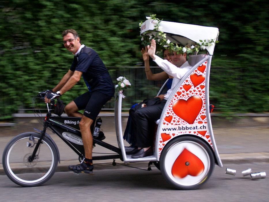 Unsere Hochzeits-Rikscha ist mit einem speziellen Herzdesign versehen und mit Kunstblumen geschmückt. Wir haben Blechbüchsen dabei, die hinten an der Rikscha befestigt werden können oder wir spielen während der Fahrt romantische Songs über den Lautsprecher. Die Fahrt mit der Rikscha ermöglicht dem Brautpaar einen Moment der Ruhe und Entspannung an dem sie Zweisamkeit geniessen können, bevor sie die weiteren Festivitäten erwarten. Der Hochzeitgesellschaft verschafft es Zeit um sich zum nächsten Standort zu verschieben.